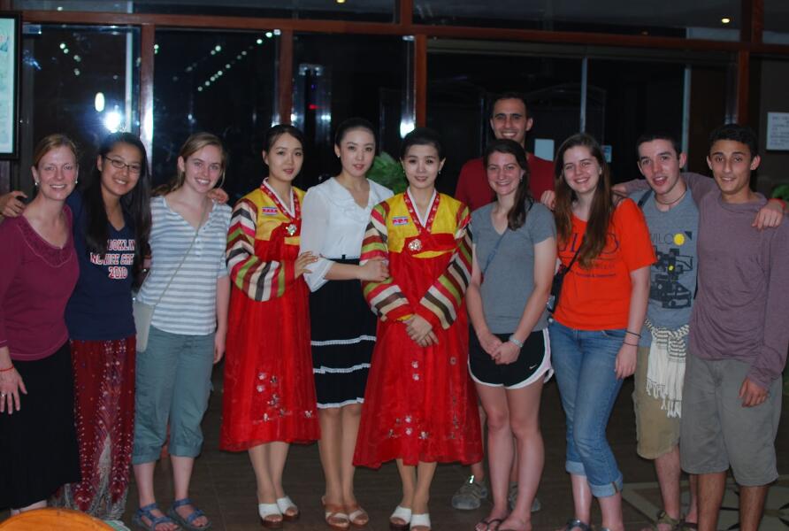 朝鮮餐廳的服務(wù)員與國(guó)外顧客合影。