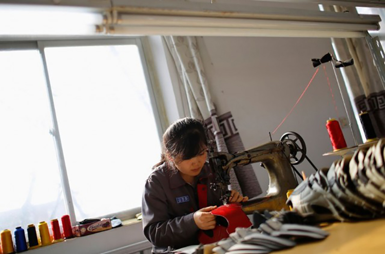 在丹東郊區(qū)的一個(gè)臨時(shí)工廠里,一位朝鮮女工正在做足球鞋。