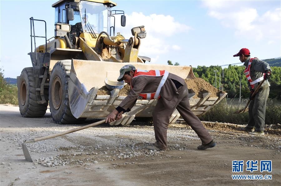 工人在云南省會澤縣駕車鄉(xiāng)的鄉(xiāng)村公路施工現(xiàn)場忙碌(10月20日攝)。
