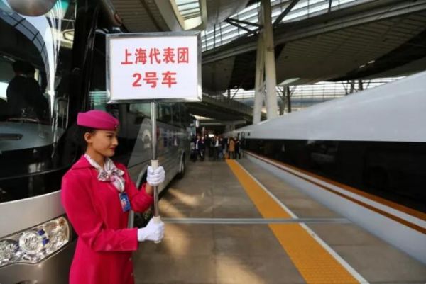 ▲2017年10月16日,上海市十九大代表乘坐“復(fù)興號”高鐵列車抵達北京南站。