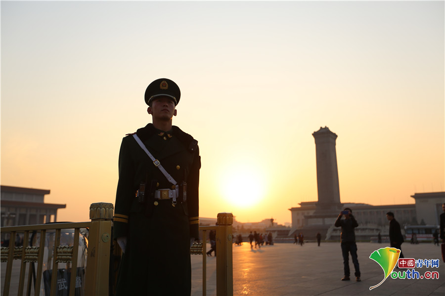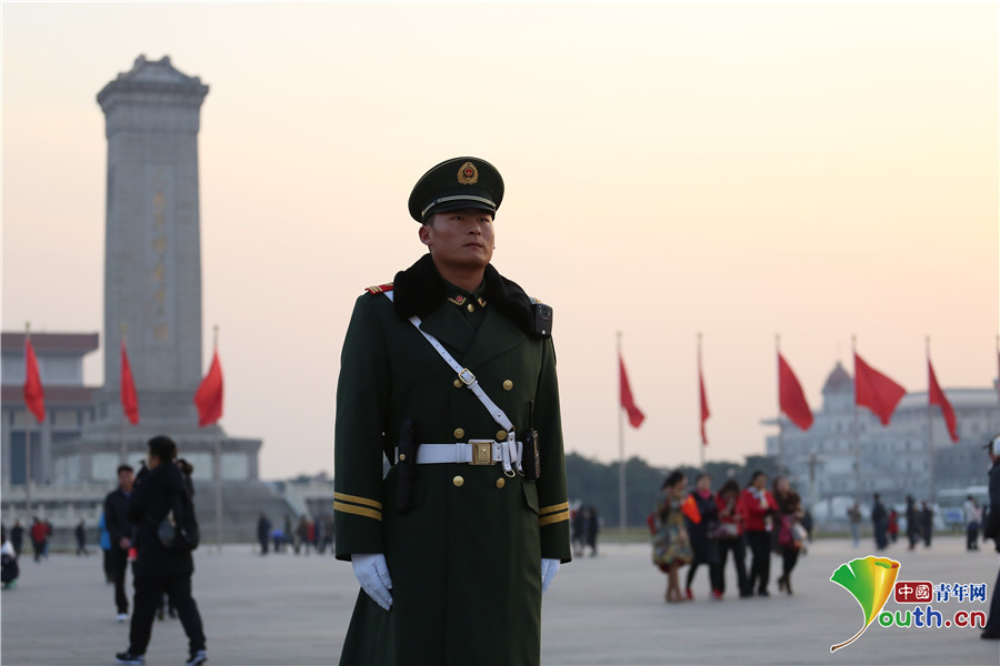11月19日下午,武警官兵在天安門廣場(chǎng)執(zhí)勤。中國(guó)青年網(wǎng)通訊員 李超 攝