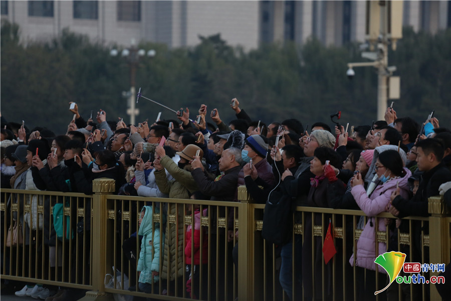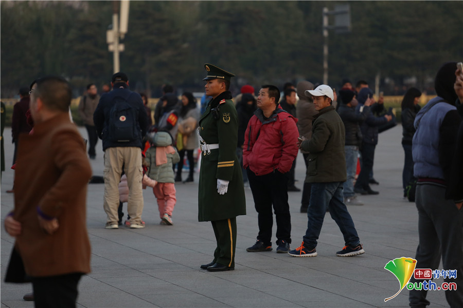 寒風(fēng)中,觀看降旗儀式的游客們。中國(guó)青年網(wǎng)通訊員 李超 攝