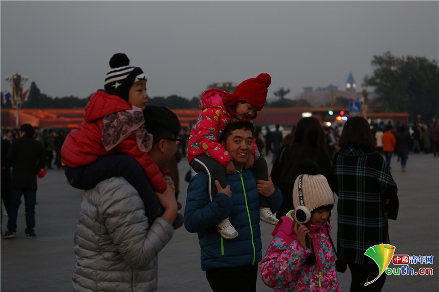騎在家長(zhǎng)頭頂上觀看降旗儀式的孩子們。中國(guó)青年網(wǎng)通訊員 李超 攝