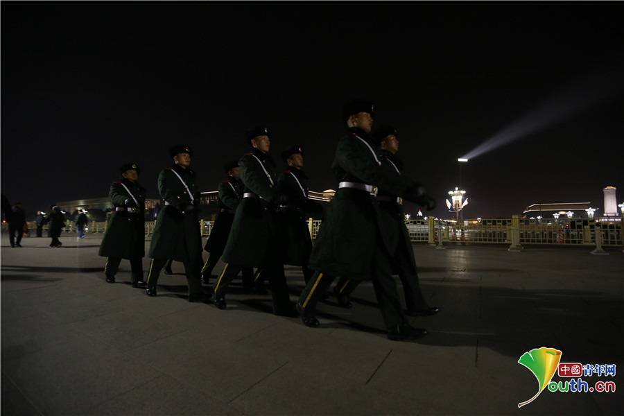 領(lǐng)班員李雪雷站著挺拔的軍姿在廣場(chǎng)中間執(zhí)勤,絲毫看不出他的“冷”。中國(guó)青年網(wǎng)通訊員 李超 攝