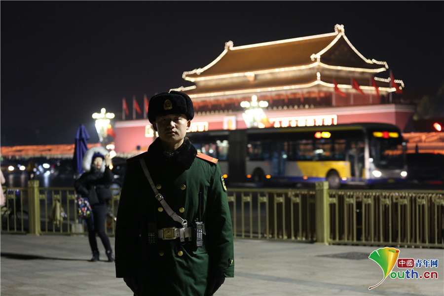 深夜執(zhí)勤的武警戰(zhàn)士。中國(guó)青年網(wǎng)通訊員 李超 攝
