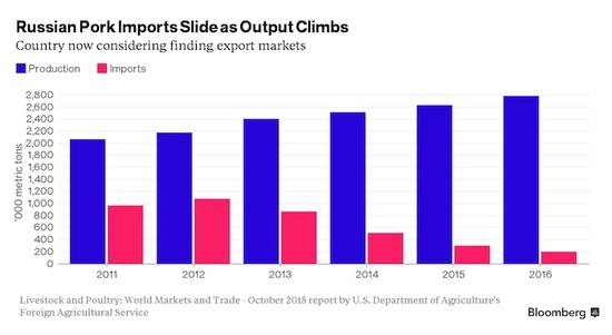 據(jù)彭博社報(bào)道,美國(guó)農(nóng)業(yè)部數(shù)據(jù)顯示,俄羅斯國(guó)內(nèi)豬肉產(chǎn)量四年里增加了26%,創(chuàng)下了歷史最高水平;與此同時(shí),進(jìn)口從2012年的峰值下降了超過(guò)80%。