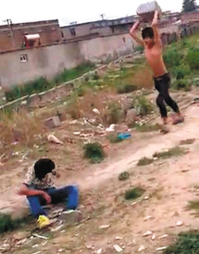 視頻顯示,6分45秒時(shí),一名打人者搬起一塊石頭,向少年背部砸去。隨后,該男子再次搬起石塊,向后走幾米遠(yuǎn),舉起石塊朝少年頭上砸。少年當(dāng)場(chǎng)昏厥,打人者則對(duì)著少年臉部撒尿。