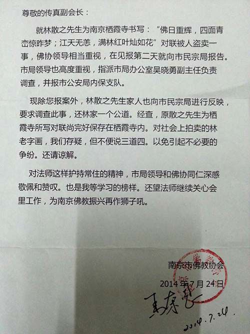 7月24日,傳真法師收到一封南京市佛教協(xié)會的回函?;睾Q,除了傳真法師報案外,林散之家人也向市民宗局反映,要求調(diào)查此事,還林家一個公道。