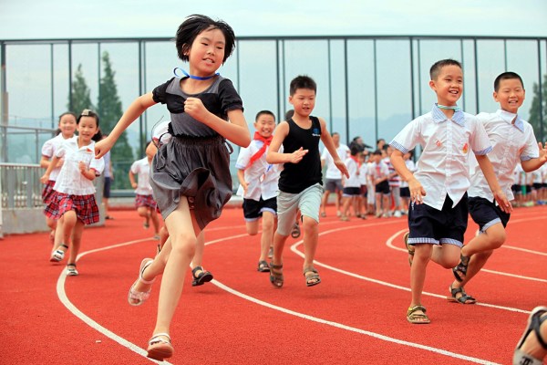2014年9月1日,浙江省臺州市,天臺縣赤城街道第二小學(xué)的房頂環(huán)形跑道正式啟用,學(xué)生們首次在環(huán)形跑道上跑步玩耍。