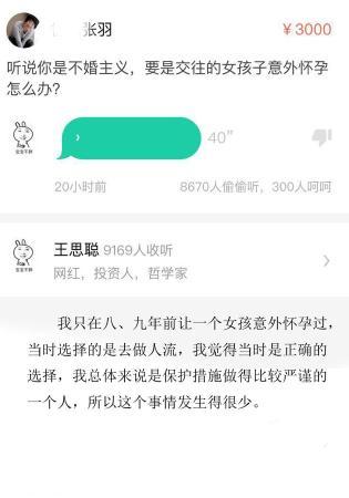 近日,某醫(yī)院醫(yī)生張羽在某平臺中向王思聰提問:“聽說你是不婚主義,要是交往的女孩子意外懷孕怎么辦?”在40秒的回答中,王思聰爆料自己毫不手軟:“我只在八九年前讓一個(gè)女孩意外懷過孕,但后來大家的選擇是流掉,我覺得是正確的選擇。 但現(xiàn)在我的保護(hù)措施是非常好的,一般不會有意外了?!鼻巴巴德牎钡木W(wǎng)友們紛紛表示:“老公坦誠得讓我震驚啊……”“感覺要上娛樂八卦頭條的節(jié)奏!”