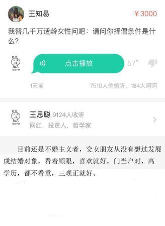 有網(wǎng)友代表幾千萬適齡女性向王思聰發(fā)問,“你的擇偶標(biāo)準(zhǔn)是什么”,王思聰坦言:“說實(shí)話,沒有考慮沒有想過這些問題,首先我目前是不婚主義者,沒想過要結(jié)婚,交女朋友有交,但從沒想過發(fā)展成結(jié)婚對象,至于交女朋友標(biāo)準(zhǔn),其實(shí)沒什么標(biāo)準(zhǔn),我喜歡就好,我和一般傳統(tǒng)家庭或是老一代的人思想不太一樣,沒想過要門當(dāng)戶對,高學(xué)歷啊,知書達(dá)理啊這些,都不是很看重,三觀正比較重要,再就是我喜歡,我看順眼就好,其他真的沒別的標(biāo)準(zhǔn)了?!?/p>