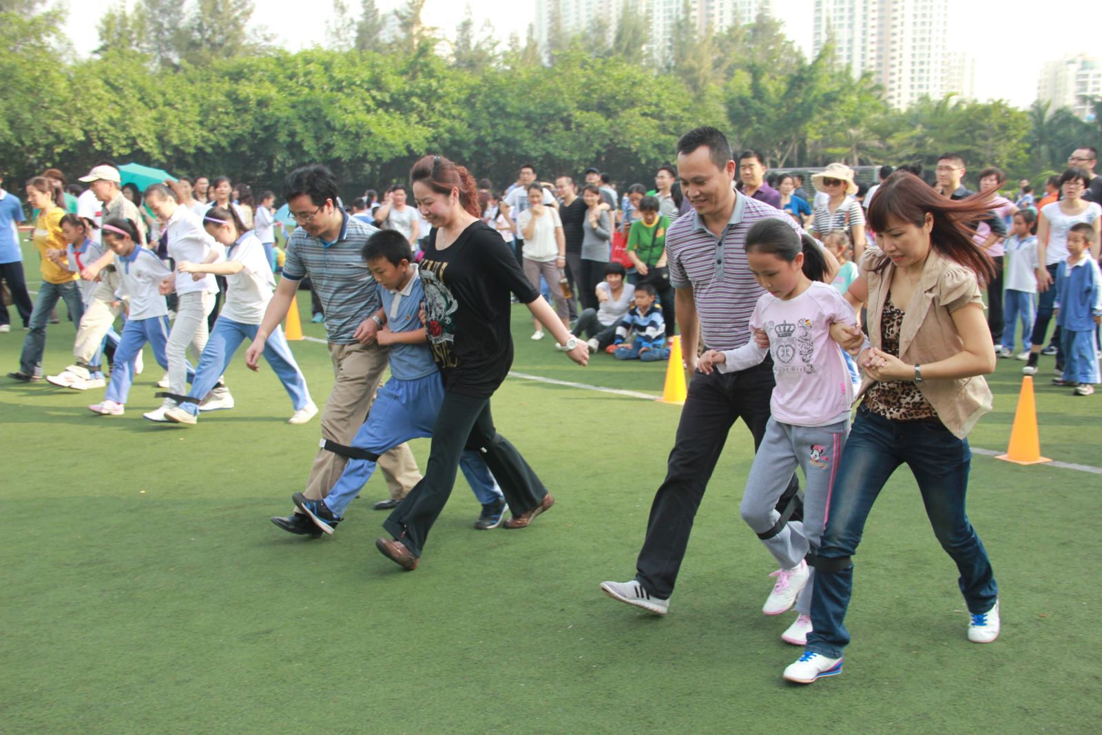 游戲規(guī)則:活動(dòng)分組進(jìn)行,每個(gè)家庭(兩大一小)為一組,家長在兩邊,孩子在中間,家長和孩子相鄰的兩條腿用10cm寬,60cm長的紅色布條綁住,聽到口令后,三人一齊向前跑,看誰先跑到終點(diǎn)為勝。(每組最多為5個(gè)家庭參與,活動(dòng)分三組進(jìn)行)