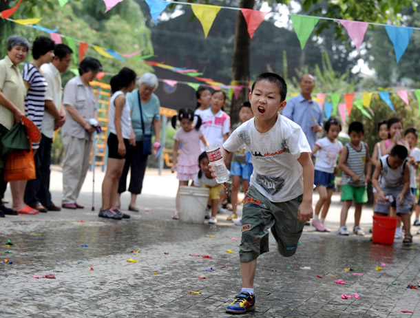 游戲規(guī)則:跑道前方設(shè)置一個(gè)水桶 起點(diǎn)外設(shè)置一個(gè)大塑料瓶,比賽開始時(shí),小朋友持水杯到水桶內(nèi)盛水后返回倒入大塑料瓶處,由孩子和兩個(gè)家長依次進(jìn)行盛水接力,大塑料瓶盛滿水者為勝(注:塑料瓶身內(nèi)設(shè)若干漏點(diǎn))。活動(dòng)共7個(gè)家庭參與,取前三名進(jìn)行頒獎(jiǎng),所有參與的家庭均有參與獎(jiǎng)。