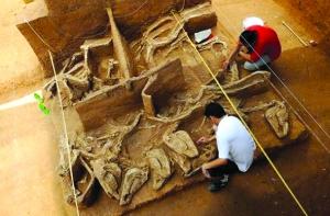 考古人員在河南安陽(yáng)發(fā)現(xiàn)戰(zhàn)國(guó)古墓群,這是考古人員在清理一處車馬坑。