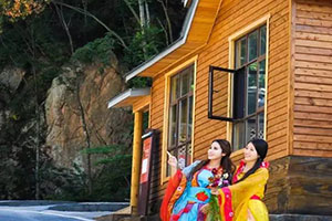 老界嶺為游客準(zhǔn)備了漢服;邀請知名攝影家、模特(七仙女)現(xiàn)場拍照;穿漢服;看表演、品美食、住木屋;