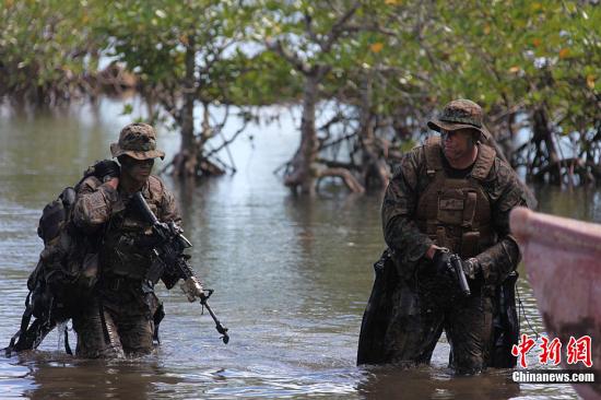 4月25日,美國(guó)與菲律賓“肩并肩2012”聯(lián)合軍演參演部隊(duì)在菲律賓南部巴拉望省普林塞薩港市的阿魯甘灣舉行“兩棲登陸”演練,美菲雙方近百名海軍陸戰(zhàn)隊(duì)士兵參加。這也是美菲“肩并肩2012”聯(lián)合軍演開(kāi)幕10天以來(lái),開(kāi)放媒體采訪規(guī)模最大的一場(chǎng)軍事演習(xí)活動(dòng)。圖為美菲海軍陸戰(zhàn)隊(duì)先遣小分隊(duì)登上灘頭。記者張明攝
