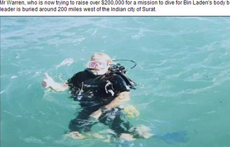 這位尋寶者名叫比爾·沃倫(Bill Warren),現(xiàn)年60歲。他稱發(fā)現(xiàn)了拉登遺體的具體位置,就在距離印度西部港口城市蘇拉特(Surat)以西320公里處的阿拉伯海底。他現(xiàn)在正努力籌集20萬(wàn)美元(約合126萬(wàn)元人民幣)經(jīng)費(fèi),以潛入海底尋找拉登的裝尸袋。