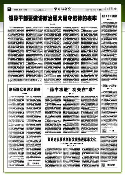 軍隊各級領導干部是部隊的帶兵人,無疑也應當成為講政治、顧大局、守紀律的“排頭兵”。領導干部只有自覺響應胡主席提出的講政治、顧大局、守紀律的要求,積極參加學習教育活動,不斷強化政權意識、責任意識和憂患意識,高標準、嚴要求、做模范,才能帶領官兵把我軍真正建設成為軍魂意識牢固、履行使命堅強的軍隊。