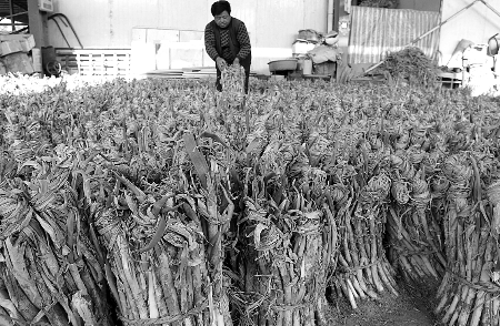 山東商販在整理待銷售的大蔥