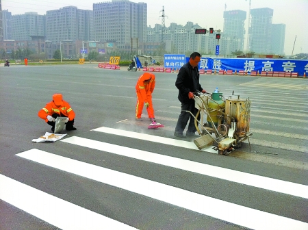 3月29日上午10時許,在金水東路與東風東路交叉口,工人們正在對該路口的斑馬線重新噴漆(如圖)?!靶聵司€施劃完5分鐘即可通行”,現(xiàn)場的工人說。