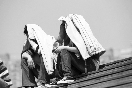 昨日鄭州氣溫較高,兩名青年用衣服抵御陽光的暴曬。