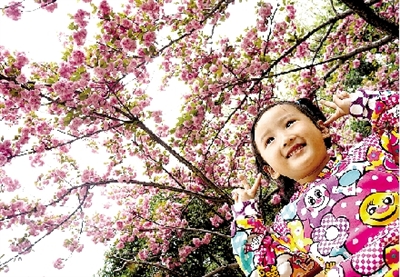 昨天,人民公園,小女孩在櫻花樹(shù)下擺出可愛(ài)的造型拍照。 記者 馬健 圖
