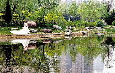 昨日中午,鄭東新區(qū)小樹(shù)林,一對(duì)新人正在拍攝婚紗照。 記者 馬健 圖
