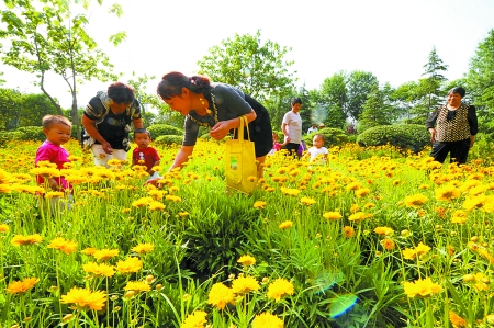 鵝黃色的花瓣,碧綠的葉子,在初夏陽光照耀下,分外鮮艷,昨天下午,記者在鄭州市未來路和航海路交叉口東南角的航海公園看到,10多畝金雞菊花開得正盛,不少市民前來欣賞。