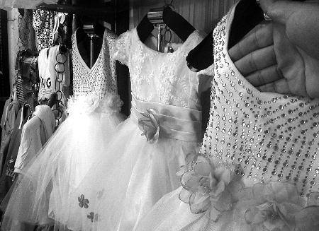 “這個(gè)送珍珠腰帶,走(賣(mài))得可好,帶一件吧!”昨天下午2點(diǎn),鄭州市豐產(chǎn)路某店鋪內(nèi),女老板正在向一位女士推銷(xiāo)熱賣(mài)的“公主裙”。仔細(xì)看,這條粉紅色的裙子,腰間綴著由花生米大小的“珍珠”做的腰帶,袖口邊緣處還貼著亮閃閃的貼片,看著確實(shí)華麗。經(jīng)過(guò)一番討價(jià)還價(jià),該女士花100元為上幼兒園的女兒買(mǎi)了條裙子。令她不滿(mǎn)意的地方,就是似乎珍珠腰帶縫得并不緊,“珍珠是一根單線穿下來(lái)的,穿不了幾次,就該斷了”。