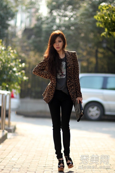 豹紋外套,個性十足。聳肩的版型,西裝的款式,穿在身上很顯氣質。內搭灰色T恤下穿黑色小腳褲,高跟鞋,優(yōu)雅女人味十足。