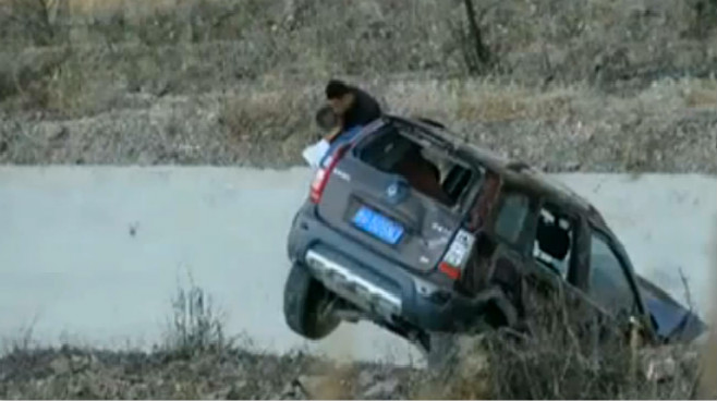 實(shí)拍:轎車(chē)剎不住飛落懸崖