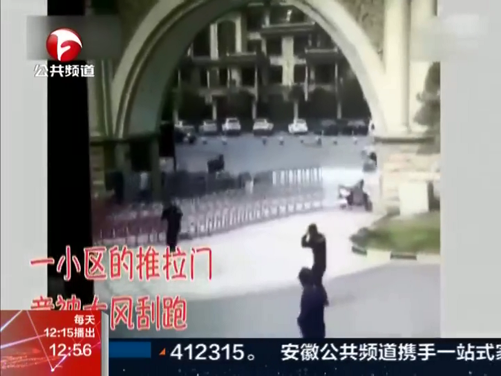 小區(qū)大門(mén)被風(fēng)吹跑 保安緊追