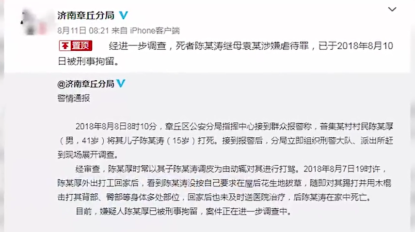 15歲男孩被父打死 繼母涉虐待被刑拘