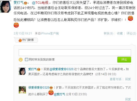 2月13日網(wǎng)友愛打氣首先曝出TCL售后的問題,其表示,TCL電視的售后讓人失望,承諾給消費者在接到報修電話的24小時內(nèi),當(dāng)?shù)氐氖酆髸鲃勇?lián)系保修者,但一直都沒有兌現(xiàn)。