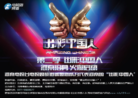 第二季《出彩中國人》河南招募火熱開啟,河南電視臺電視劇頻道誠邀您成為代表河南的“出彩中國人”。歌曲戲曲、民間絕活、精彩創(chuàng)意、舞蹈雜技等,相信自己,你就是“最出彩的中國人”!趕快報名,您將有機會前往上海、北京參加全國節(jié)目的錄制。有本事、有故事,就有機會登上人民大會堂的莊嚴舞臺!