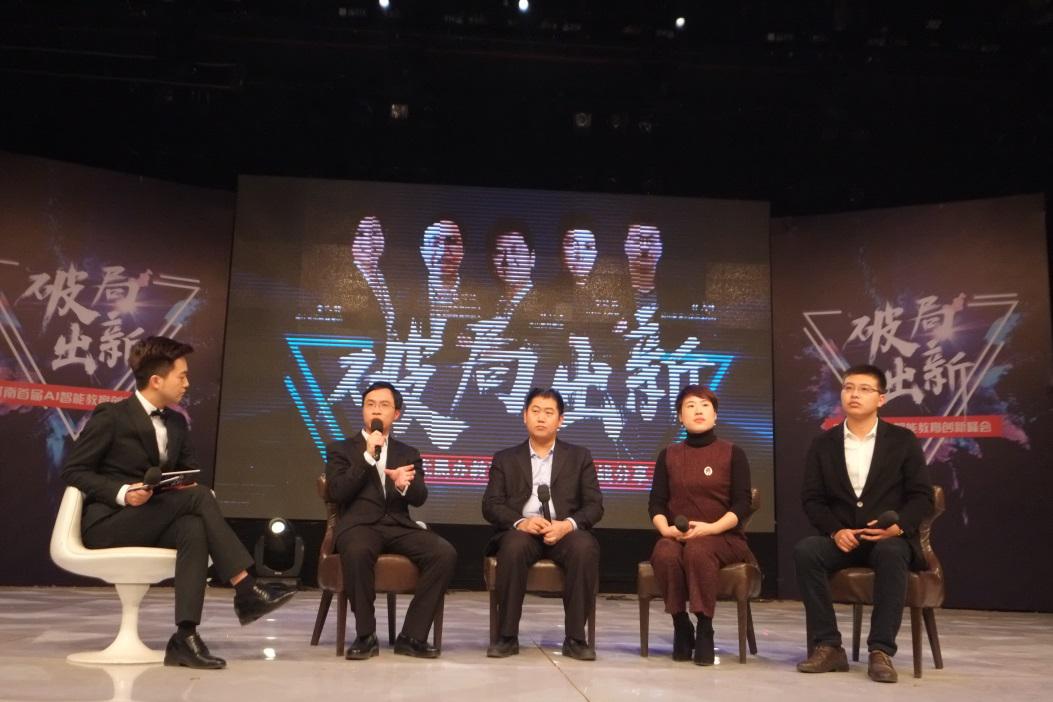 最后,美克創(chuàng)客創(chuàng)始人韓可蘇先生、 大山教育集團(tuán)董事長張紅軍先生、現(xiàn)代教育集團(tuán)運(yùn)營總監(jiān)董文靜女士、鄭州星源外國語學(xué)校校辦副主任張高峰先生圍繞著《AI時(shí)代民辦教育智能創(chuàng)新實(shí)戰(zhàn)經(jīng)驗(yàn)分享》的話題進(jìn)行了圓桌論壇。四位嘉賓分別從社會(huì)熱點(diǎn)到教育理念展開實(shí)戰(zhàn)分享,充分展望未來AI技術(shù)與教育結(jié)合的創(chuàng)新方向。
