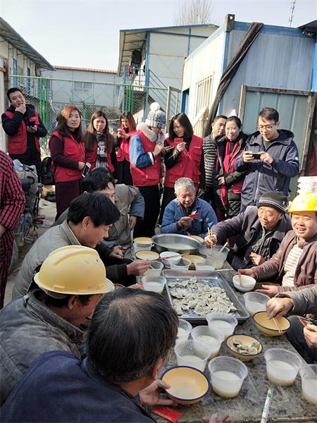 另一邊,在鄭州市花園路廣電南路交叉口,主持人劉雯和韓佳帶著十幾名義工早早的在路邊就開始忙活了。他們要給附近50多名環(huán)衛(wèi)工人煮餃子。平時,環(huán)衛(wèi)工們的午飯都很簡單,甚至都是隨便對付的,這次,主持人和義工們特意選在離工人們中午休息比較近的地方,搭起了臨時的灶臺,給工人們做上一頓熱騰騰的餃子。由于條件簡陋,臨時灶臺上的火十分不穩(wěn)定,劉雯和韓佳脫下厚重的外套,擼起袖子親自生火,費了好大勁終于把餃子下鍋了。吃上熱騰騰的餃子,環(huán)衛(wèi)工人們特別開心。一位老大爺由衷的感嘆道:“好久沒吃過這么暖心的午飯了,謝謝你們。”