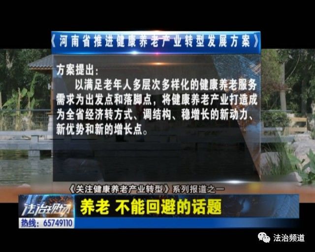 生、老、病、死是自然規(guī)律。而養(yǎng)老,是每個家庭無法回避的話題。近日,我省出臺了關(guān)于養(yǎng)老產(chǎn)業(yè)發(fā)展的新政策。有業(yè)內(nèi)人士稱,這是惠及老年人以及養(yǎng)老產(chǎn)業(yè)發(fā)展的重大利好消息。那么,這些新政策有什么內(nèi)容,會帶來哪些福利?河南省發(fā)展改革委、河南廣播電視臺法治頻道,聯(lián)合推出了六集系列報(bào)道《關(guān)注健康養(yǎng)老產(chǎn)業(yè)轉(zhuǎn)型》,從今天開始,我們將為您逐一介紹。