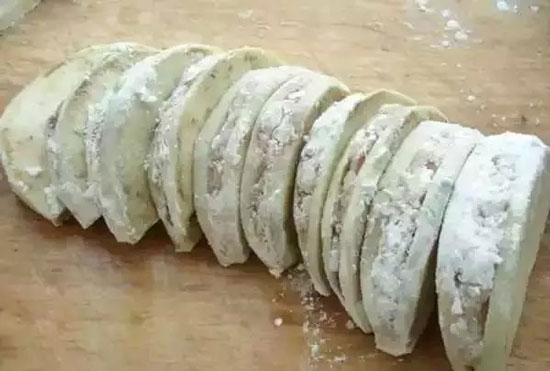 3. 茄子去皮切成連刀片,要切的薄一點,便于成熟,抹少許面粉。