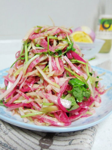 取一個(gè)綠皮水果蘿卜,去皮,切絲,加入少許調(diào)料,拌勻即可,做法簡單,味道不錯(cuò)。在調(diào)料上,加入少許橙汁或檸檬汁,讓蘿卜入口后口感更豐富而有層次,有著淡淡的橙子香氣。