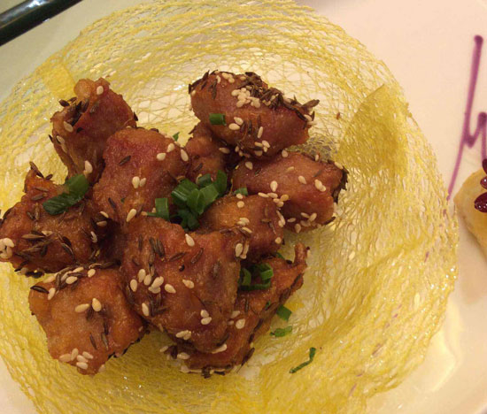 3、然后將腌制好的牛肉粒用六成熱油溫炸至橙黃色撈出。