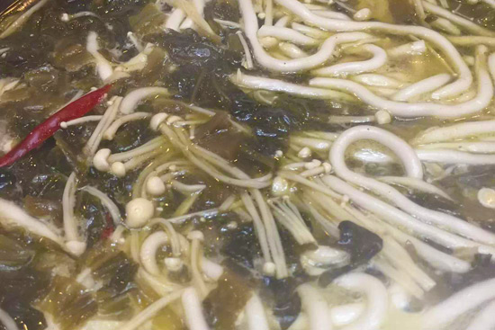 3.鍋中加入少許油,爆香蒜片、泡椒,加入料酒,隨后放入酸菜,超出酸菜的香味,然后加入開(kāi)水,再放入金針菇和土豆粉,加入鹽、胡椒粉、料酒調(diào)味,中火慢慢煮,成熟撈出用來(lái)裝盆墊底。