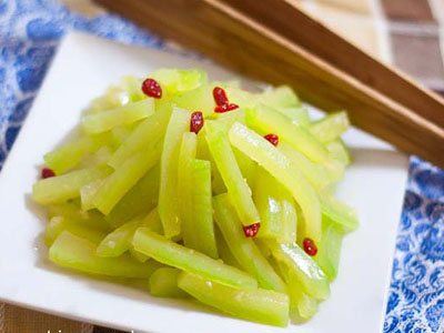 4.將西瓜皮、蒜茸、米醋、糖和香油拌勻即可,可以再加少許枸杞點(diǎn)綴。