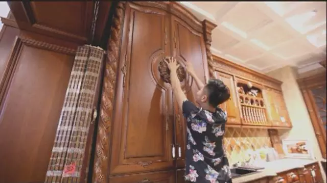 上到吊頂,下到任何的窗戶沙發(fā),整個(gè)甚至連墻上全部鑲嵌了木頭,包括它的床后面的這個(gè)背景墻,也全部都是定制的木制家具。