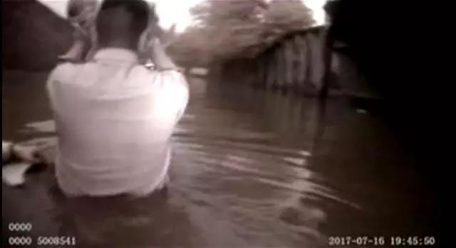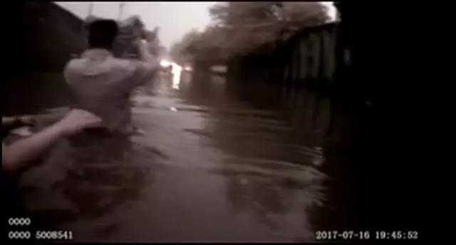 由于積水太深,為了不讓孩子受到傷害,輔警張婧先把最小的嬰兒接過(guò)來(lái),高高舉起,緩緩走到岸上。