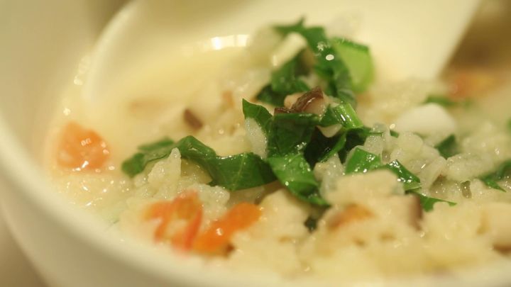 米粒提前炸過,配著蝦仁、香菇、青菜和西紅柿丁,趁熱吃大米還有嘎嘣嘎嘣的脆響,要是不急就再泡上一會(huì)兒,米飯吸滿了湯汁就又是另一種軟糯的口感。