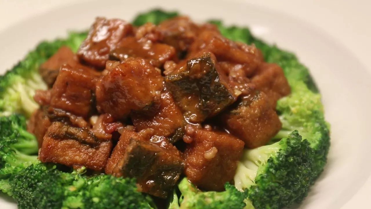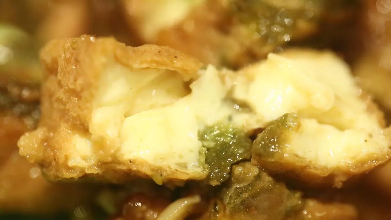 主廚研發(fā)的新式廣東菜——萬怡黑豆腐,乍一看很像豆腐泡,咬開卻是嫩滑的像布丁一樣的雞蛋豆腐。制作時(shí)還特意加入了海苔,也增添了幾分鮮香。肉末和高湯燒成醬汁裹在黑豆腐上,再配上入口即化的雞蛋豆腐,今天的晚飯穩(wěn)了!