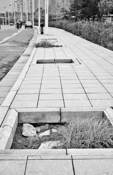 樹坑內(nèi)沒有種樹,長(zhǎng)了野草。