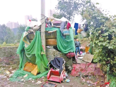 他們從花園路劉莊到鄭上路,走了近2個(gè)小時(shí)。走到鄭上路須水河西岸時(shí),發(fā)現(xiàn)在一塊荒蕪的墳地中,有一窩棚,隱約看到有身影在走動(dòng)。近前看到,一位瘦黑的老人站在雨里,正在一簡陋土灶上煮面條。老人身上的衣服已淋濕,陪老人的是一條流浪狗,狗是老人撿的。窩棚很小,僅能容下一人,蜷縮著才能躺下。由于窩棚漏雨,鋪蓋內(nèi)也是濕的。